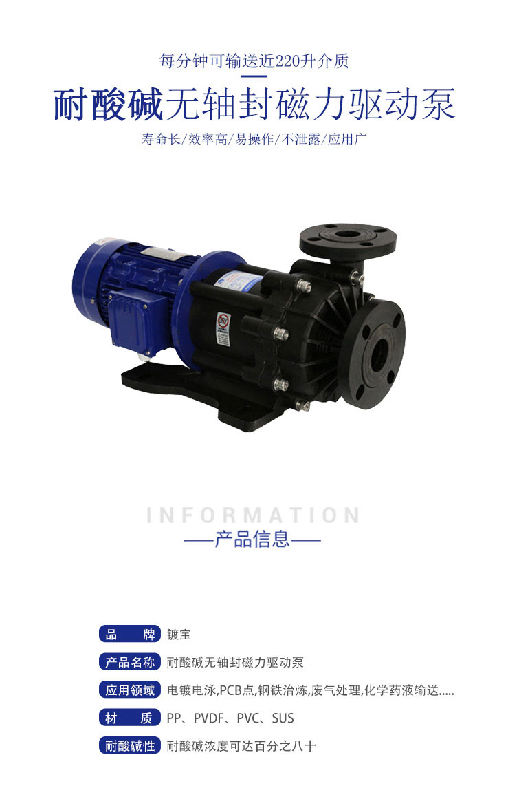 MD系列磁力泵結(jié)構(gòu)小巧,防漏, 在各個行業(yè)廣泛應用,以其耐腐蝕性和耐用性而擁有廣大用戶的贊譽。主要材質(zhì)使用FRPP、PVDF ETFE ,可以用來輸送多種腐蝕性的液體。MD系列因其結(jié)構(gòu)小巧,非常適用于過濾、噴淋、清洗、蝕刻等各種表面處理相關工藝。